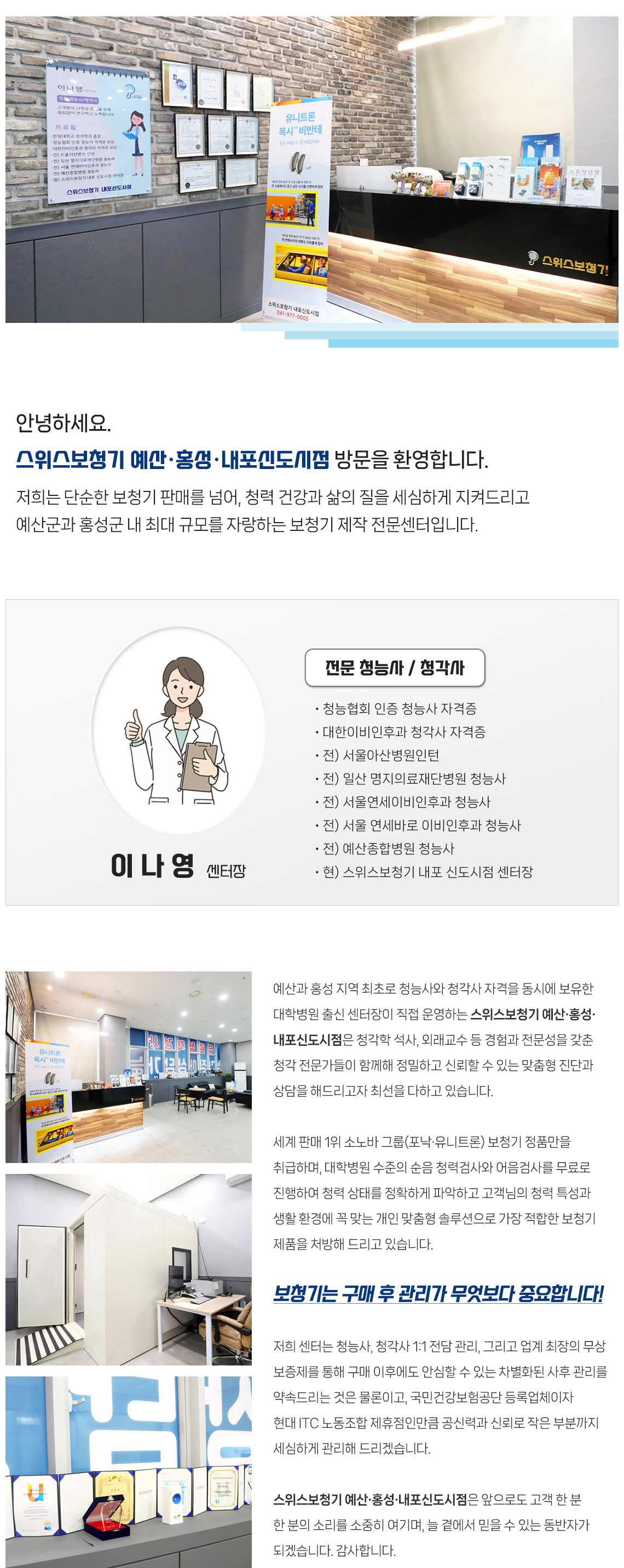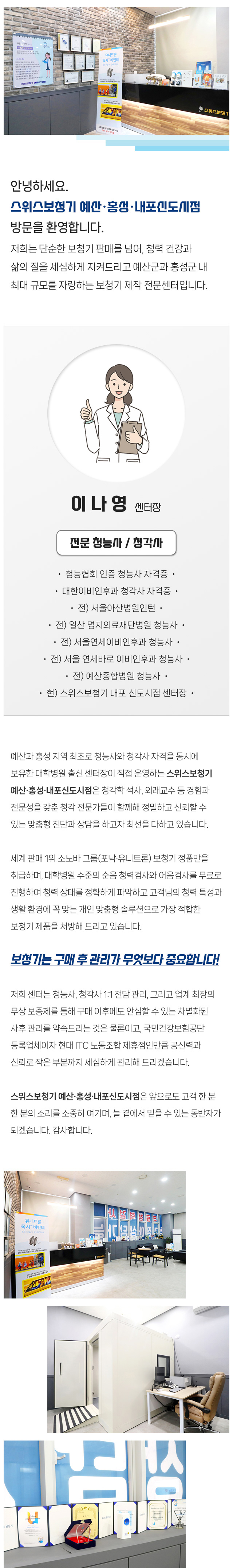 상호 : 스위스보청기 예산,홍성,내포신도시점 대표자명 : 윤중식 대표번호 : 041-977-0005 주소 : 충남 홍성군 홍북읍 의향로 263